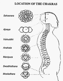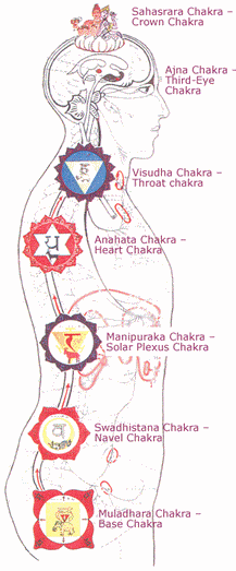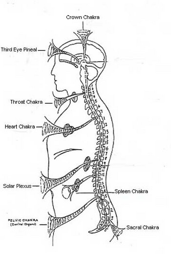 A csakrák a gerincoszlopból indulnak ki, és a képtől eltérően, test mellső és hátsó részén találhatóak.