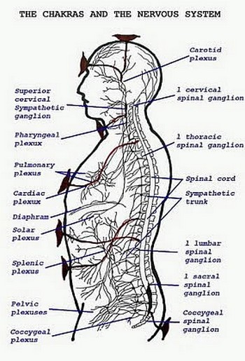 A főcsakrák kapcsolódnak a plexusoknak nevezett idegcsoportokhoz. Az ábrától eltérően, a csakrák, a test hátsó részén is jelen vannak és mérhetőek.